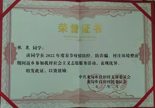 A2013的张泉,他回到他的家乡龙沟乡良田村后,积极参加“返家乡”的社会实践公益服务活动,为建设美丽乡村工作贡献一份青春力量。在做好个人防护保证自身安全的条件下,他配合乡村工作人员参与了疫情防控工作和村庄环境整治工作,同时还深入群众为乡亲们宣传了防电信诈骗知识,推动反诈骗知识入脑入心,进一步加强了良田村电信网络诈骗工作。