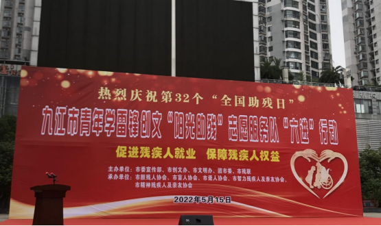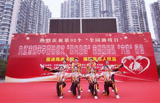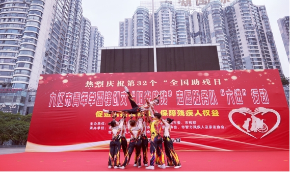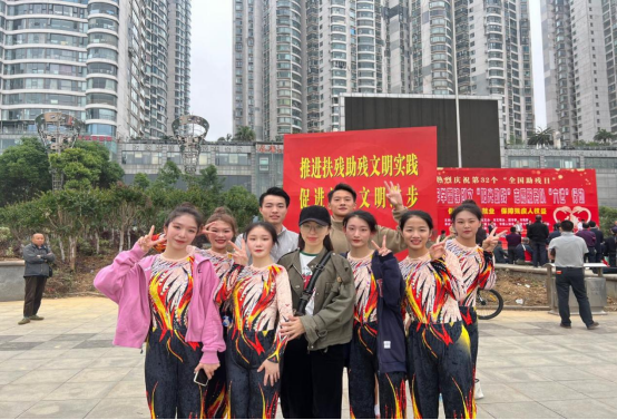 2022年5月15日,九江市市委宣传部、市创文办、市文明办、市团委、市残联等部门联合举办了青年学雷锋创文“阳光助残”志愿服务队“六进”行动,ac米兰官方网站健美操队由李娟老师带领八名同学受邀参加本次“阳光助残”活动。