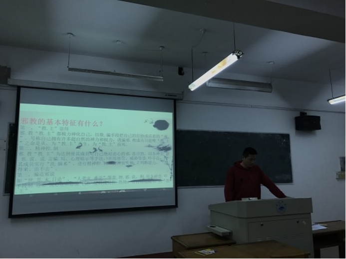 班会上,班主任准备了许多资料,首先是通过一个个的事例,使同学们对邪教的本质有了更加深刻的了解。接下来通过视频、课件等资料,积级进行反邪教法制教育的宣传工作,使广大学生通过此次主题班会了解到邪教是什么?同学们畅所欲言,交流学习体会,畅谈了自己对邪教的看法以及它的危害性。最后,班主任对同学们的发言进行了总结,让同学们健康生活、拒绝邪教。