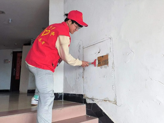 活动中,大学生志愿者在社区工作人员的带领下,来到社区居民小区,用抹布、铲刀、墙刷、扫把等工具,认真仔细的清除墙面、门柱、立杆、垃圾桶、护栏上的各类违法小广告,以实际行动助力九江市文明城市创建。