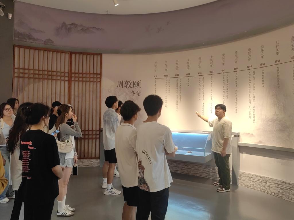 踏入纪念馆,同学们跟随讲解员的脚步,通过珍贵的历史文物、详实的图文资料,深入了解周敦颐的生平事迹与思想成就。从《爱莲说》中“出淤泥而不染,濯清涟而不妖”的高洁品格,到“诚” “公” “廉”的为官理念,周敦颐的思想精髓如清风拂面,涤荡心灵。