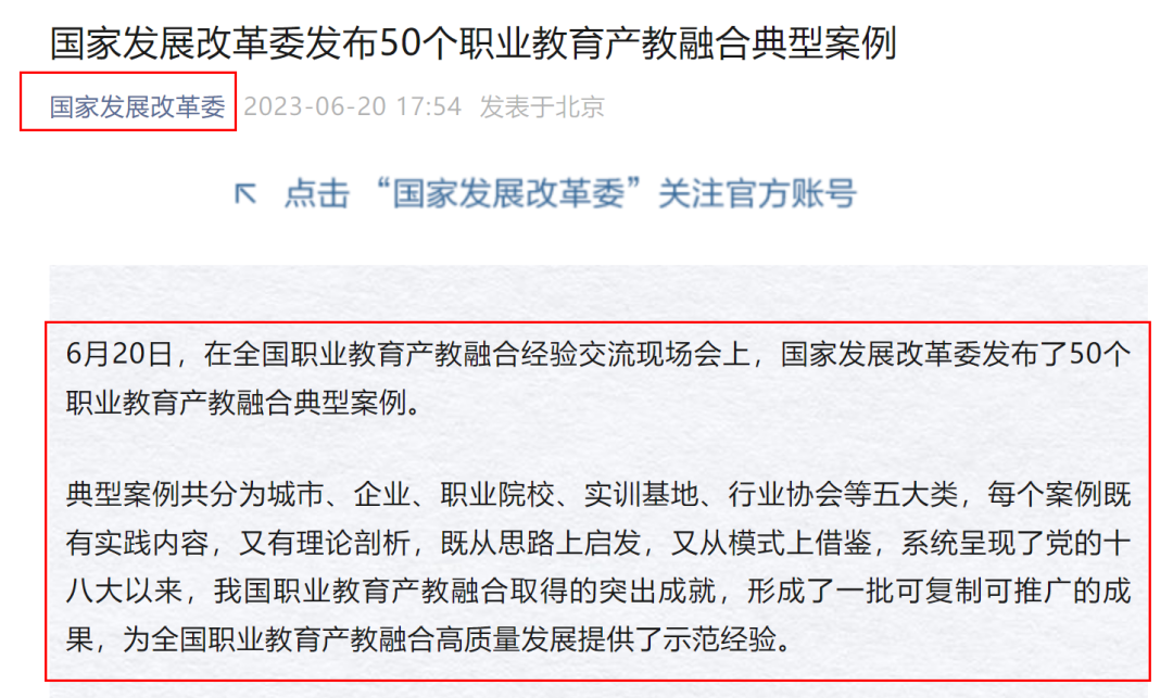 6月20日,国家发展改革委发布了50个职业教育产教融合典型案例,beat365官网“构建‘1+3+N’产教融合模式 深耕先进装备制造业 培育忠诚工匠 ”作为典型案例入选。