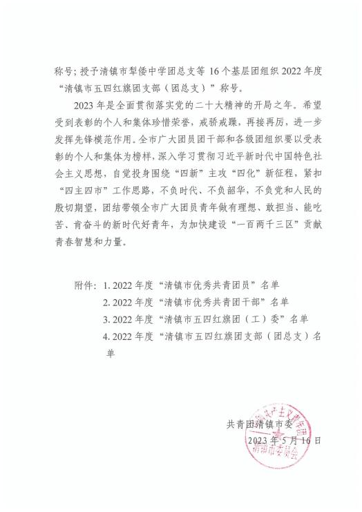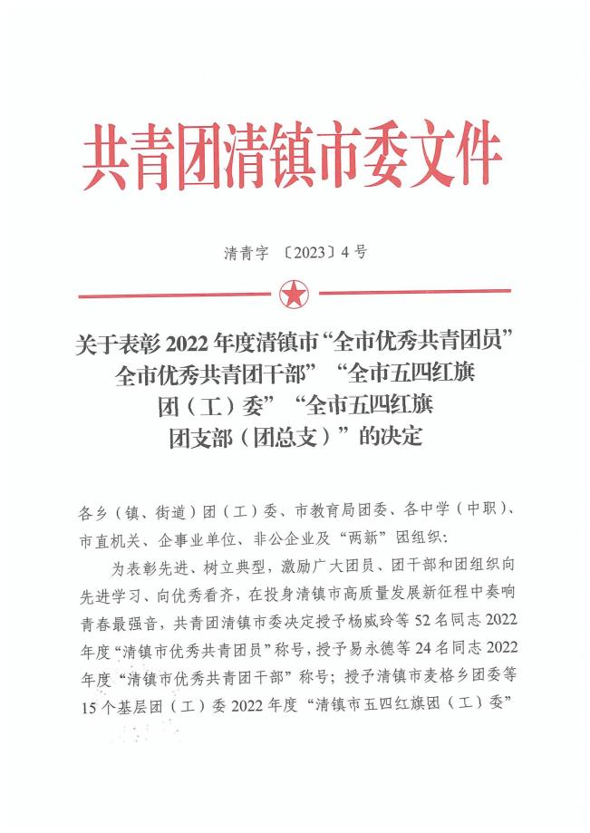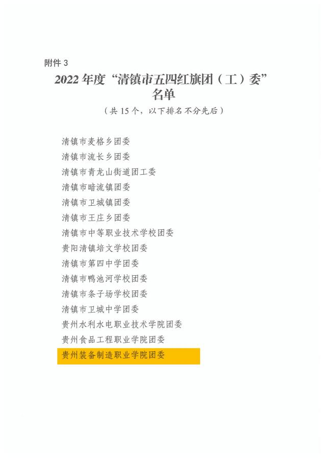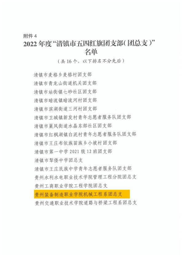 近期,在共青团清镇市委开展的清镇市2022年度“优秀团员”“优秀共青团干部”“五四红旗团(工)委”“五四红旗团支部(团总支)”评选表彰工作中,beat365官网机械工程系魏春迪同学荣获2022年度清镇市“优秀团员”称号,机械工程系团总支书记彭敏老师荣获2022年度清镇市“优秀共青团干部”称号,校团委荣获2022年度清镇市“五四红旗团(工)委”称号,机械工程系团总支荣获2022年度清镇市“五四红旗团支部(团总支)”称号。