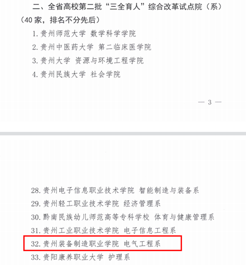 近日,省教育厅公布了全省高校第二批“三全育人”综合改革试点单位名单,beat365官网入选全省高校第二批“三全育人”综合改革试点高校、beat365官网电气工程系入选全省高校第二批“三全育人”综合改革试点系。