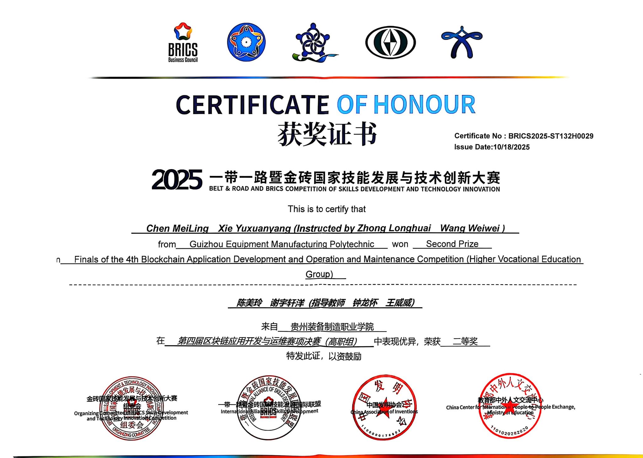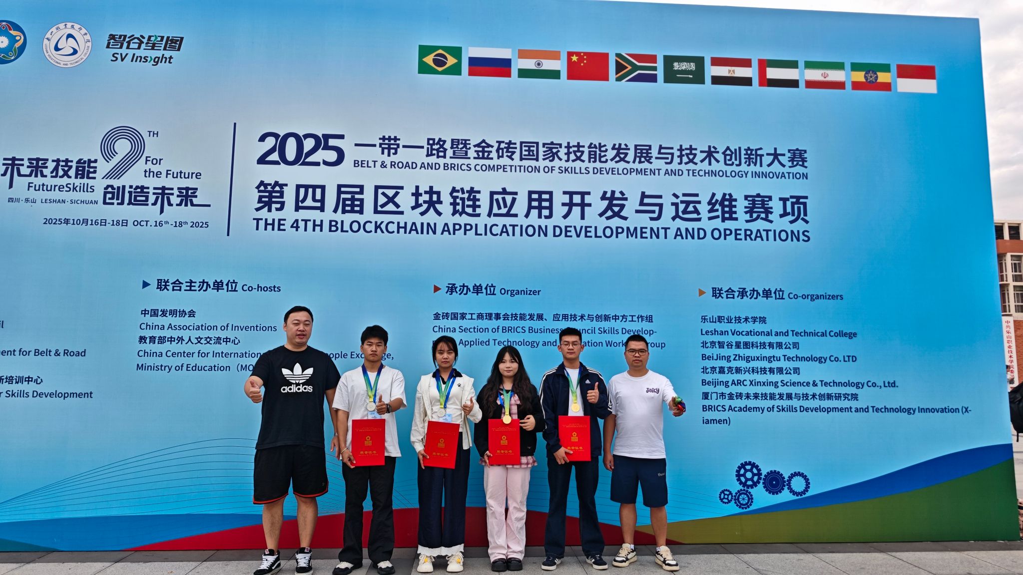 10月18日,2025一带一路暨金砖国家技能发展与技术创新大赛区块链应用开发与运维赛项全国总决赛落下帷幕。beat365官网学子在比赛中表现出色,由龙权、王海军老师指导的团队荣获金奖,钟龙怀、王威威老师指导的团队斩获银奖。