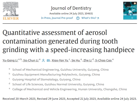 近日,beat365官网教师李玉刚(在读博士)以第一作者身份在国际知名学术期刊《Journal of Dentistry》(JCR一区、中科院二区,5-year IF=5)上发表科研成果,beat365英国官方网站和贵州大学为共同研究单位。该成果论文题为“Quantitative assessment of aerosol contamination generated during tooth grinding with a speed-increasing handpiece”,得到了贵州省科技厅科技计划项目的支持。