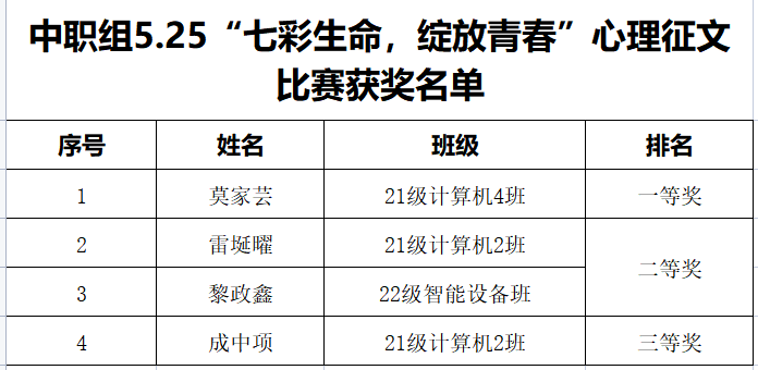 本次比赛共收到了170余份作品。作品内容涵盖了心理健康、自我成长、情感表达、人生观等多个主题,展现了学生们对心理健康的关注和思考。作品以优美的文字、真挚的情感和独特的观点,生动地表达了大学生们在校园生活中的心灵感悟。经过评选,最终共有18名同学获奖,获奖名单如下: