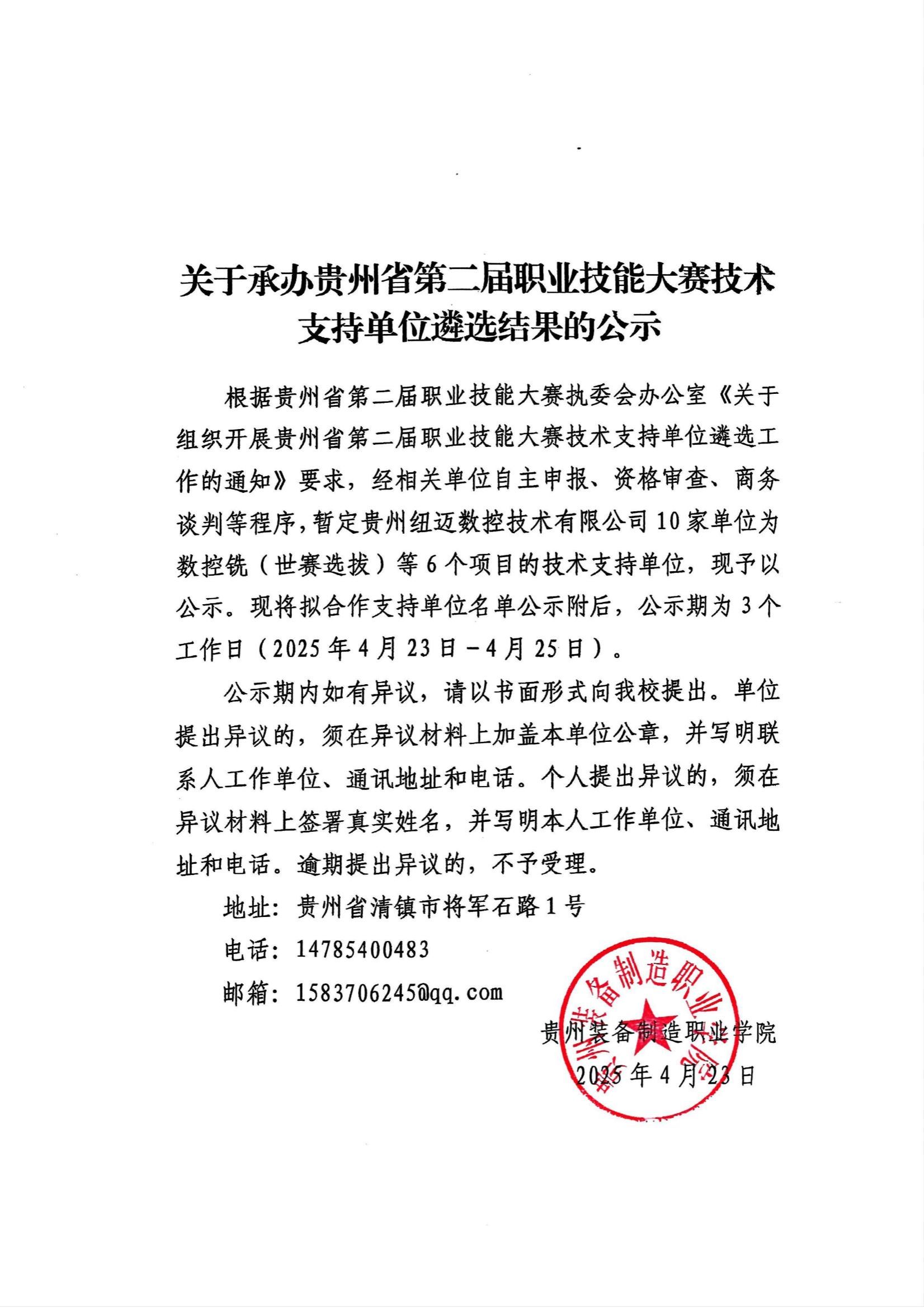关于承办贵州省第二届职业技能大赛技术支持单位遴选结果的公示
