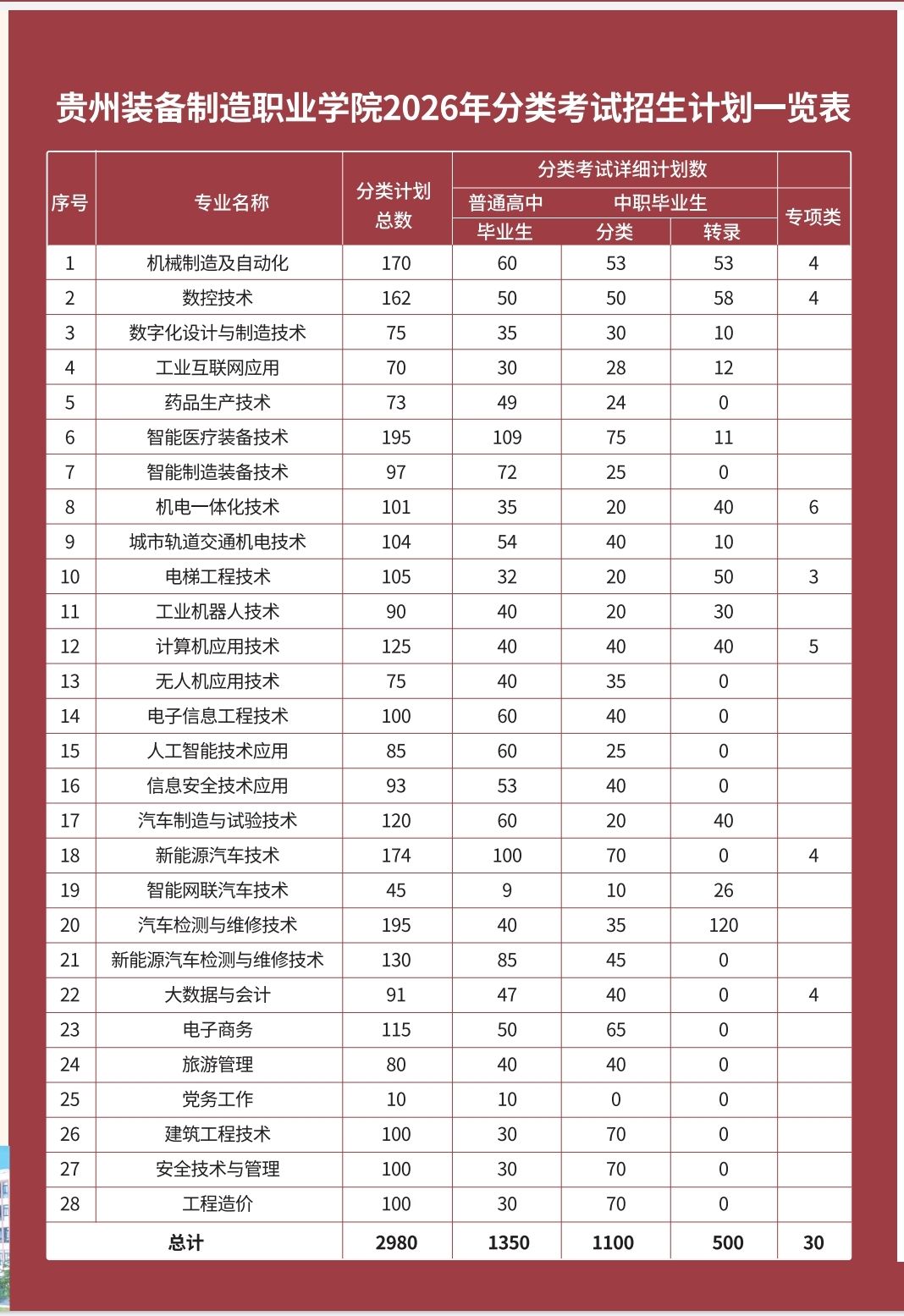 第六条 招生计划详见省招生考试院公布的2026年贵州省高职(专科)分类考试招生专业目录。