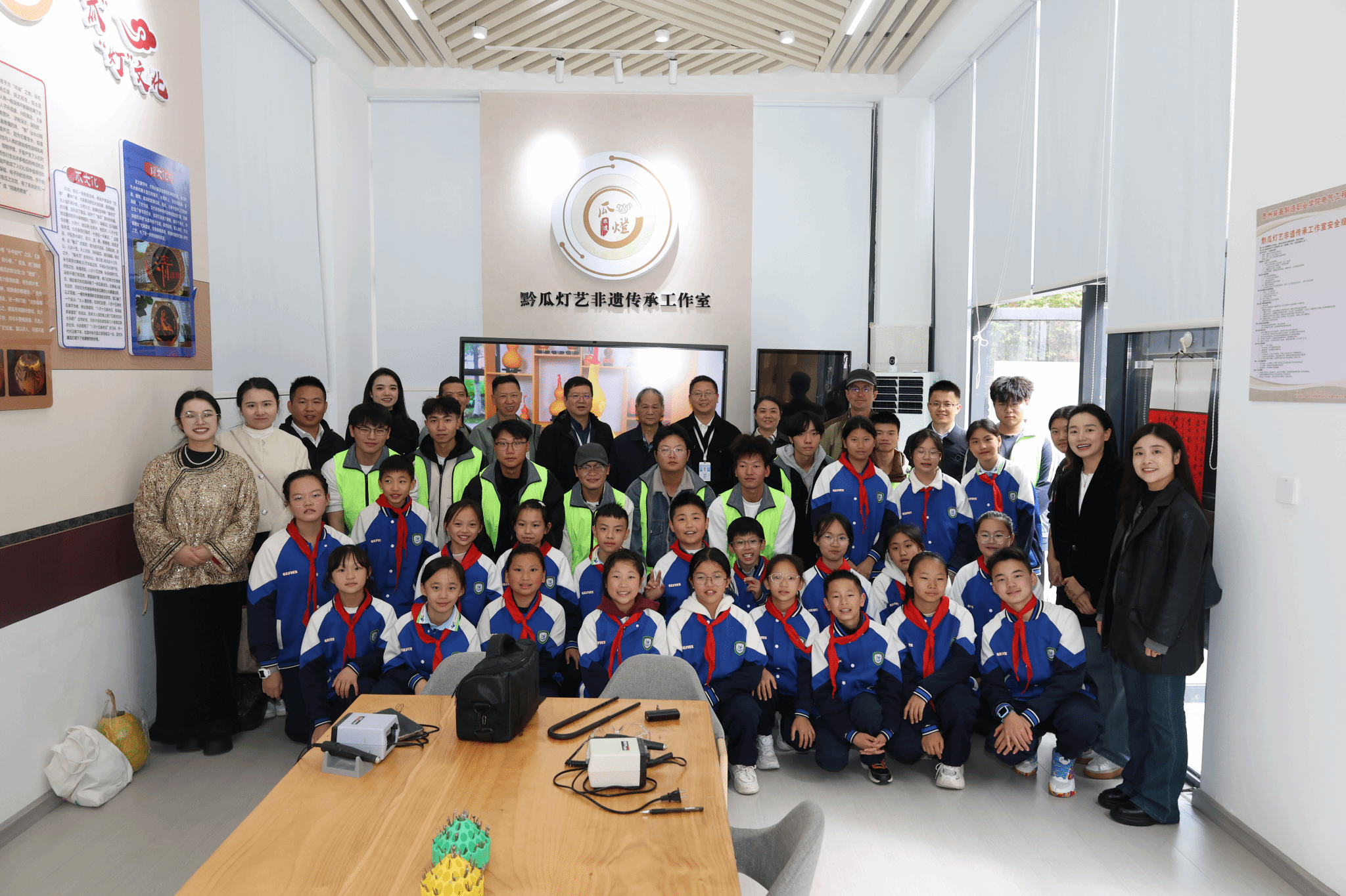 校外领导嘉宾及小学生们参观黔瓜灯艺非遗传承工作室