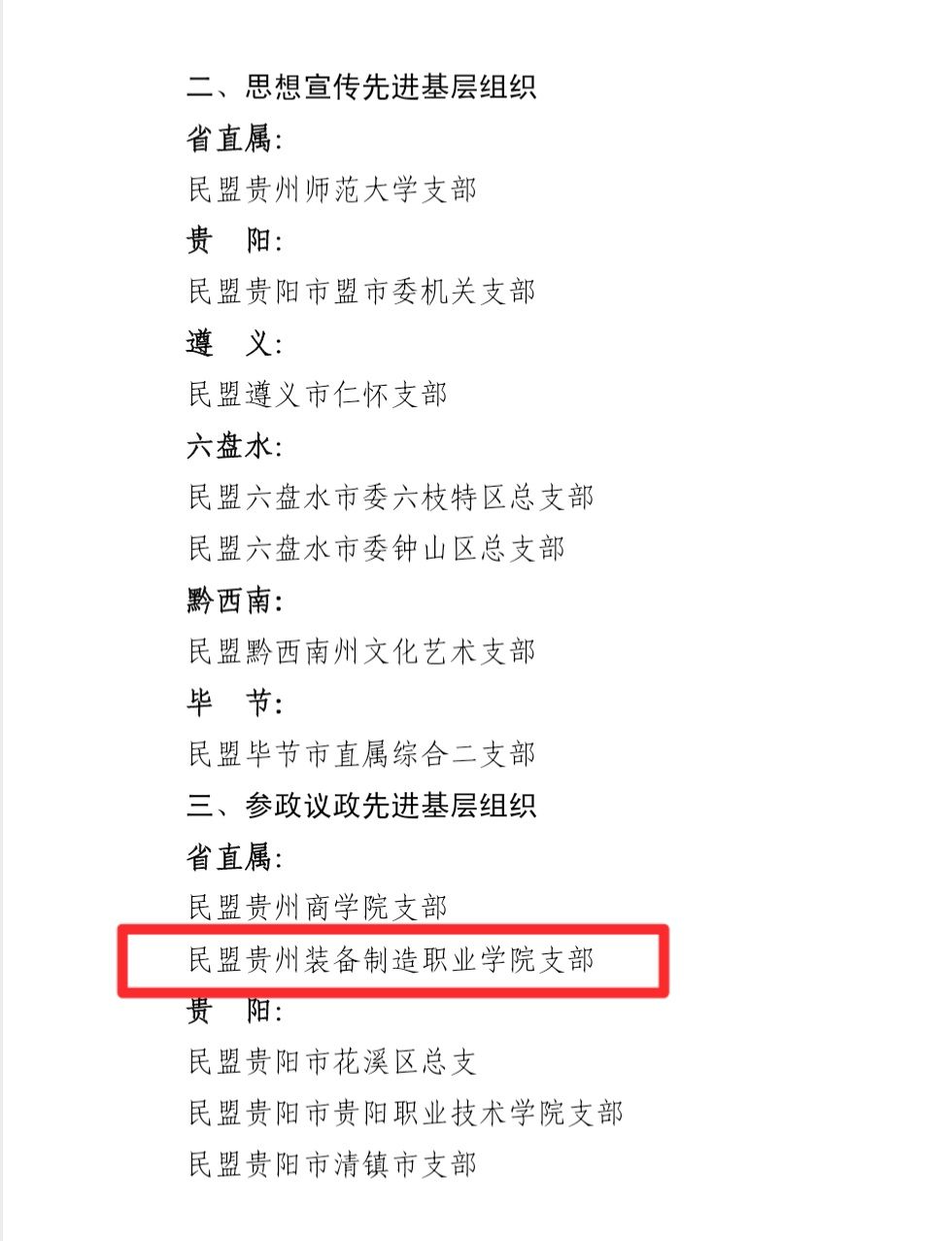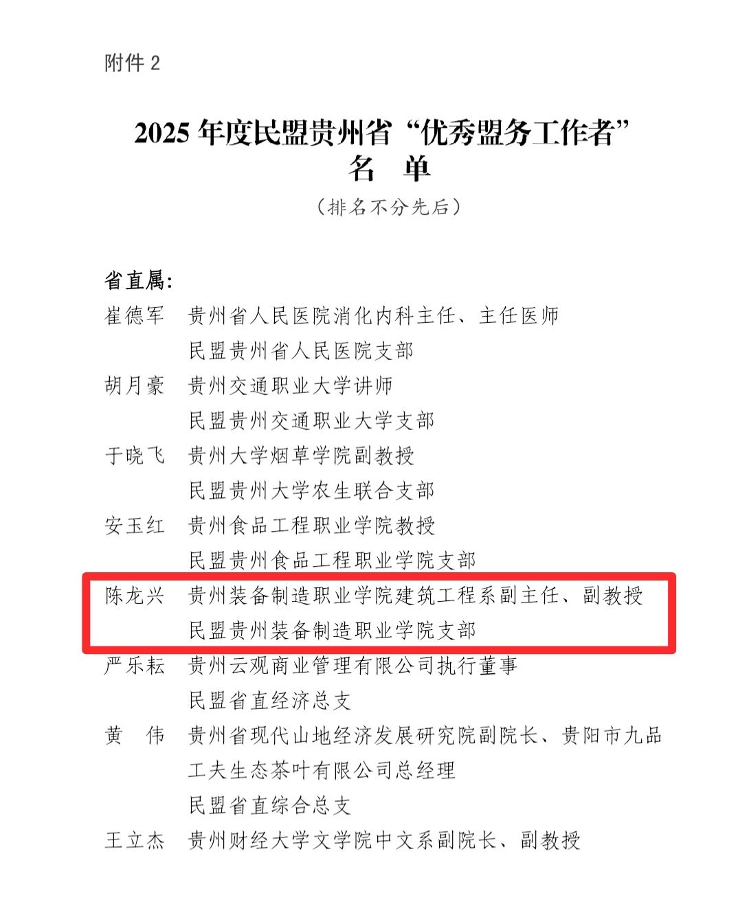 2025年12月30日,民盟贵州省委印发关于表彰2025年度先进基础组织和优秀个人的决定,民盟beat365英国官方网站支部获2025年度民盟贵州省“参政议政先进基层组织”,beat365官网建筑工程副主任、副教授陈龙兴获2025年度民盟贵州省“优秀盟务工作者”。