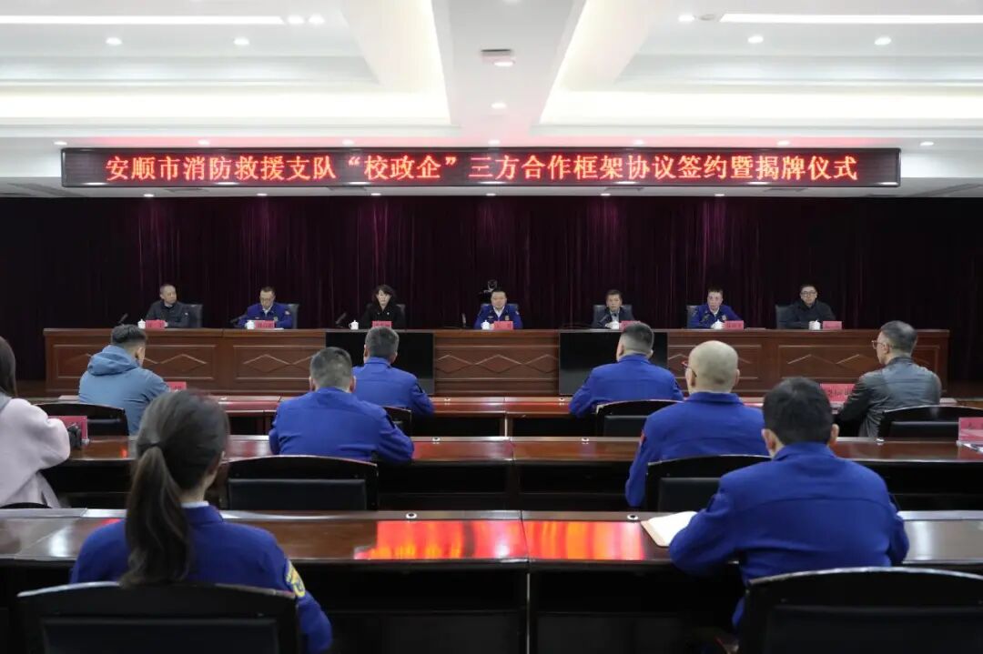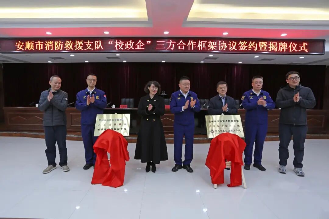 1月19日,学院与安顺市消防救援支队、视宇科技的三方合作签约暨基地揭牌仪式在安顺市消防救援支队举行。此次合作旨在响应“贵州省消防职教联盟”战略部署,推动联盟实体化运行。安顺消防支队支队长王勇,beat365英国官方网站党委委员、副院长孔杰,贵州视宇智能科技有限公司总经理张琦出席仪式并发表致辞。beat365英国官方网站党委委员、副院长李秀丽,安顺消防支队政治部主任张皓军,副支队长刘高鹏,贵州视宇智能科技有限公司技术总监杜宇等三方分管领导及相关科室负责人参加仪式。