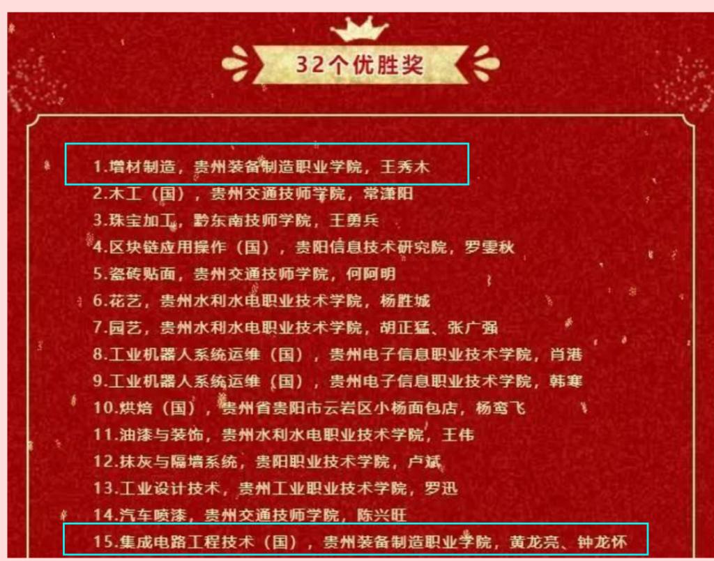 9月16日至9月19日,经过4天的激烈角逐,中华人民共和国第二届职业技能大赛在天津圆满闭幕。此次比赛,共有4045名来自全国各地的参赛选手同台竞技,beat365官网共派出8名选手代表贵州省参加5个赛项的比拼。beat365官网参赛团队通过奋力拼搏,获得2个优胜奖的好成绩(其中1个世赛项目,1个国赛精选项目)。实现了beat365官网在本项赛事的重大突破。增材制造赛项(世赛项目)参赛选手王秀木获得第四名好成绩,入选中国国家集训队(全国前五名进入),获全国技术能手称号,授予西部技能之星荣誉称号。教师黄龙亮、钟龙怀参加集成电路工程技术(国赛精选)项目获得优胜奖。