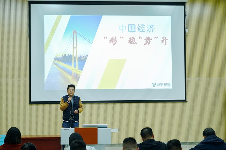 2023年12月4日,在博识楼102阶梯教室,学院党委副书记、院长金焱同志以“中国经济‘形’稳‘势’升”为题讲授专题党课。机械工程系党总支全体党员及学生代表100余人参与这次党课学习。会议由机械工程系团总支书记、学生科科长彭敏老师主持。