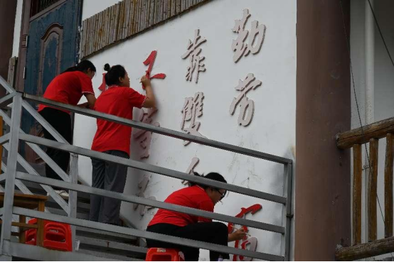 图为实践队员为巴力村宣传内容重新上色