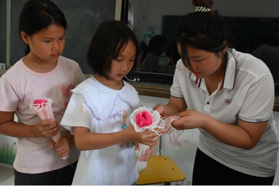 图为实践队员为小朋友制作的扭扭花进行包装
