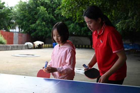 图为实践队员指导小朋友们打乒乓球