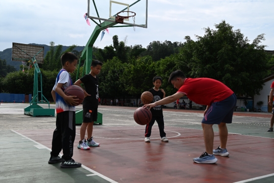 图为实践队员指导小朋友们打篮球