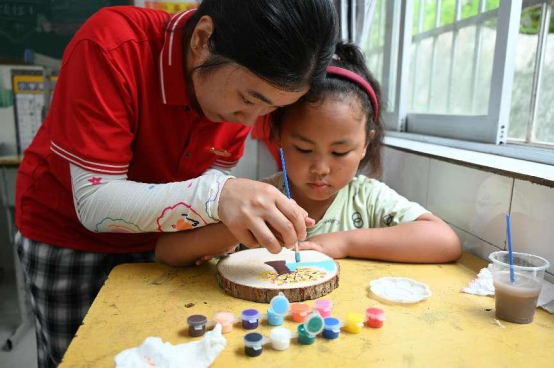 图为实践队员指导小朋友制作木板画