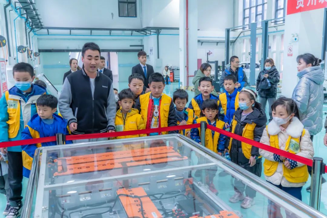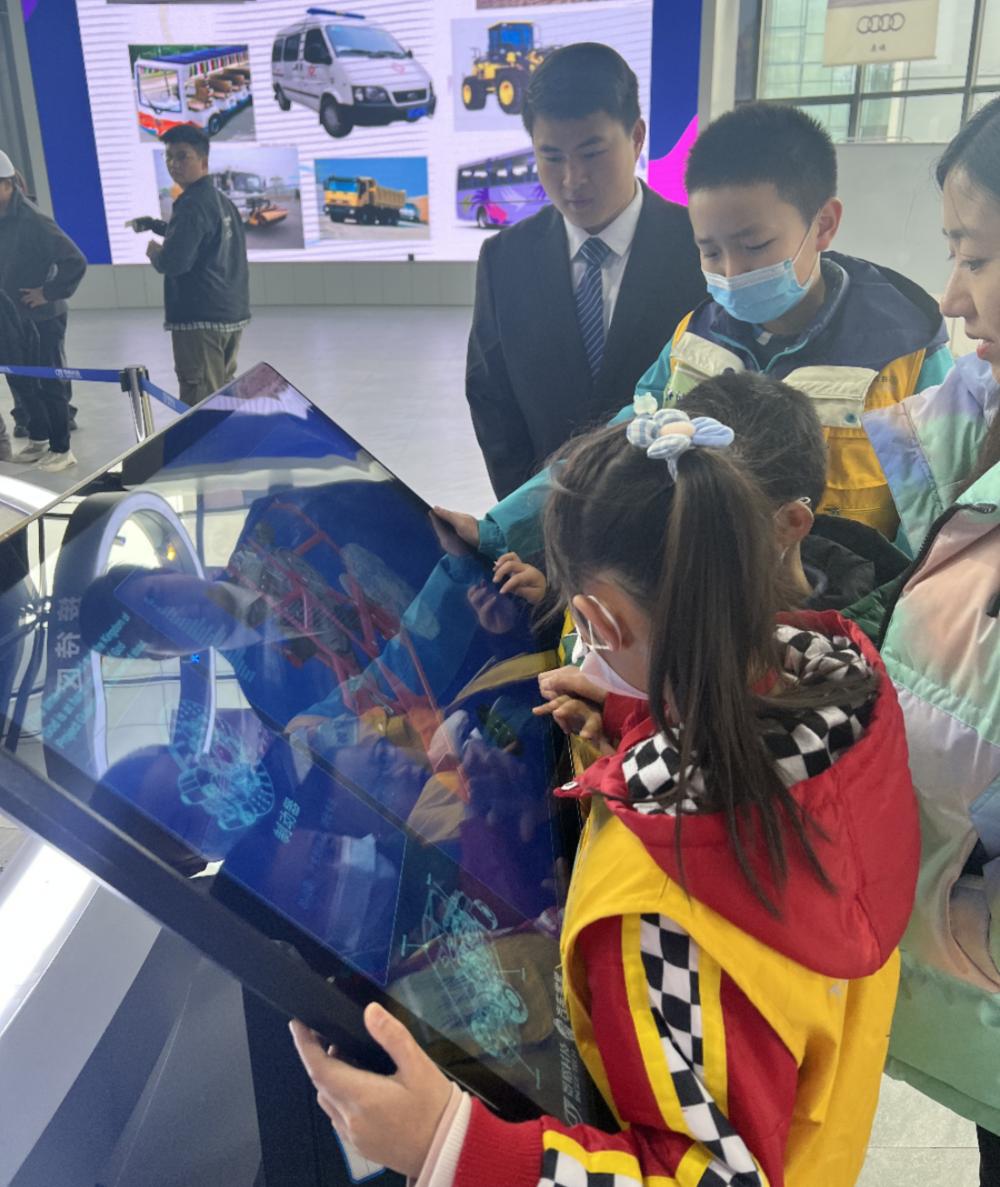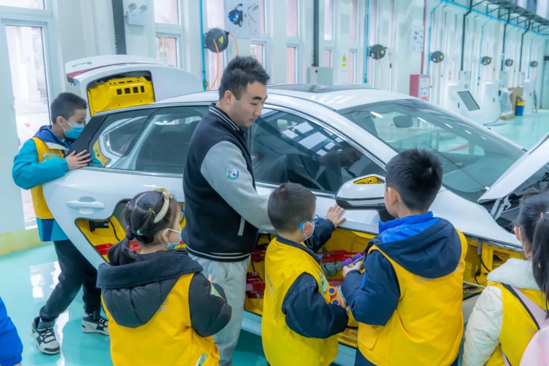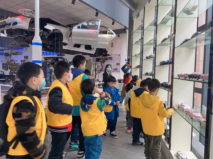 随后,由讲解团成员袁林同学带领孩子们参观新能源汽车场馆,讲解新能源汽车电池、车身结构、电控系统、科普新能源汽车新技术等,交流互动中,小朋友们经历了一堂生动的新能源汽车科普体验课,身临其境感受到充满活力的技术创新氛围,领会勇攀高峰、敢为人先的创新精神。
