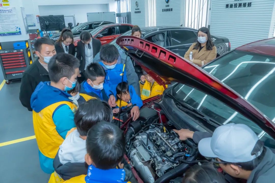 在汽车检测与维修实训基地和智能制造实训基地场馆,由讲解团成员张港、冉真海等带领小朋友们进行“小小汽修工”实操体验,这是孩子们最期待的一个环节,换空气滤芯、清洗节气门、加玻璃水、拆装轮胎,戴上安全帽、拿起扳手,“小小维修工”跃跃欲试,Get新技能。