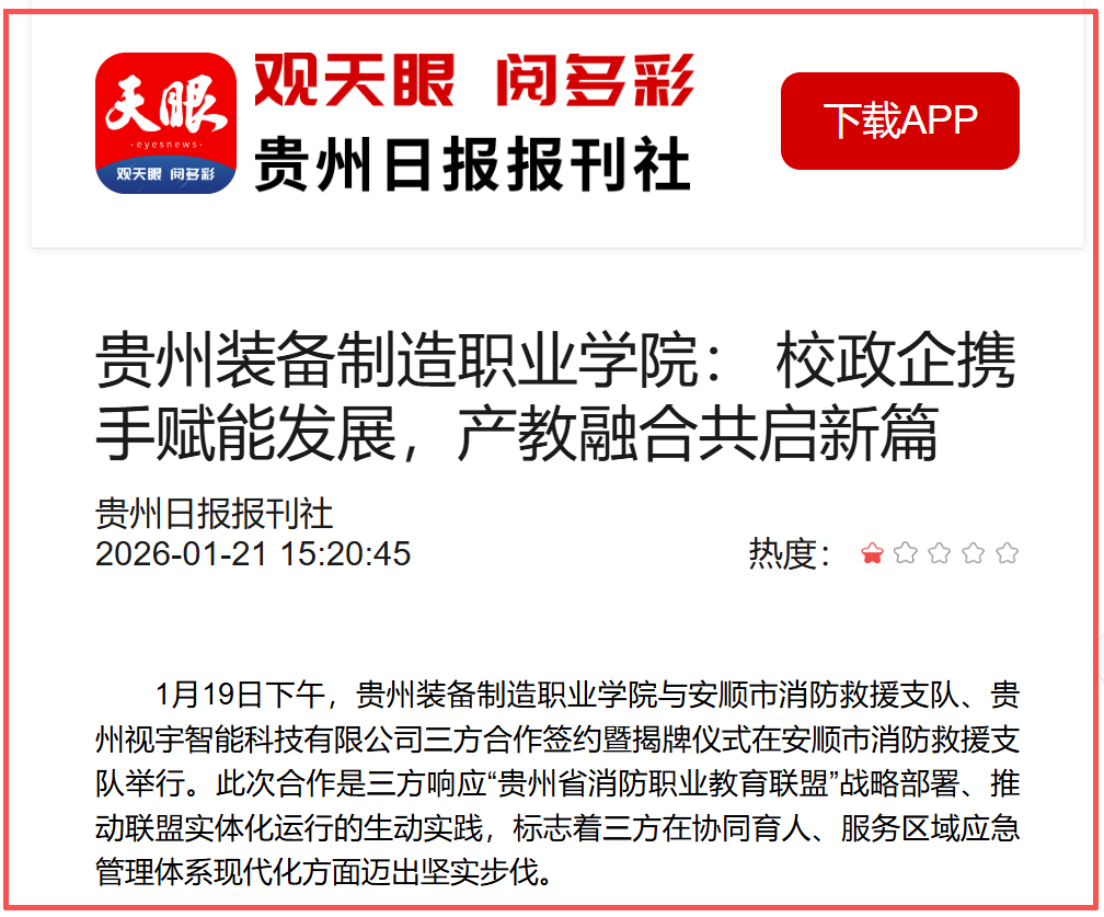 展望未来,三方将以此次合作为起点,聚焦无人机低空经济技术研发、场景应用及消防救援无人机实战操控等核心需求,建立多维度常态化沟通协调机制。通过联合开发课程、共建实训基地、共育复合型人才,推动合作蓝图落地见效 —— 既助力贵州低空经济产业链补链强链,培育全链条人才队伍;又强化消防救援技术赋能与人才储备,提升区域应急救援智能化、高效化水平,为赋能低空经济、服务国家战略提供坚实支撑。