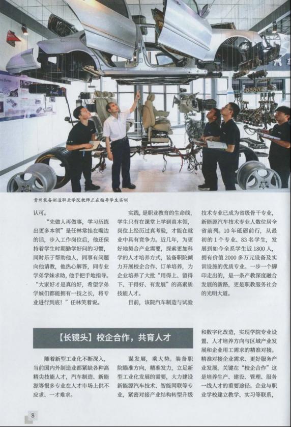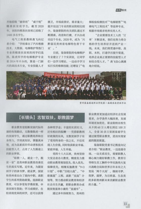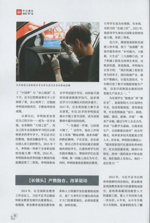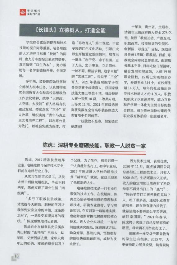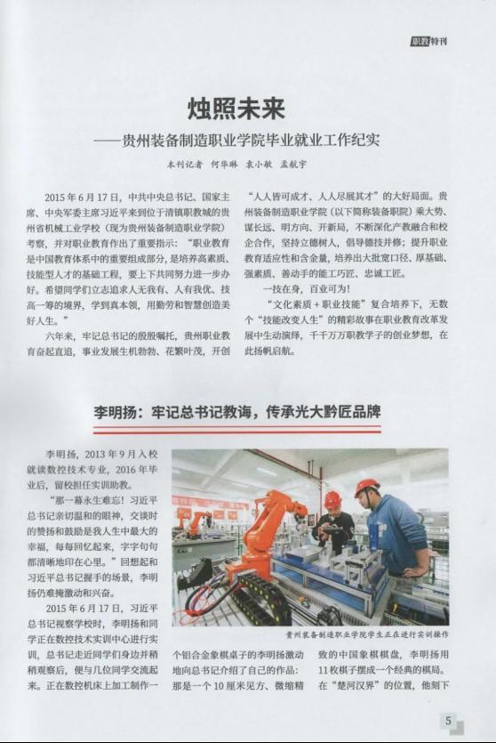 2021年12月15日,《贵州教育》全省职业教育大会特刊以“烛照未来—beat365英国官方网站毕业就业工作纪实”为题,讲述了beat365官网牢记习近平总书记到beat365官网视察时的殷殷嘱托,乘大势、谋长远、明方向、开新局,不断深化产教融合和校企合作,坚持立德树人,倡导德技并修,提升职业教育适应性和含金量,培养出大批宽口径、厚基础、强素质、善动手的能工巧匠、忠诚工匠。