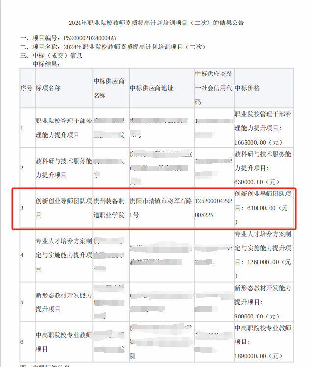 6月14日,贵州省政府采购网公布2024年职业院校教师素质提高计划培训项目(二次)中标结果,beat365英国官方网站成功中标品目六:创新创业导师团队项目,中标金额为63万元。