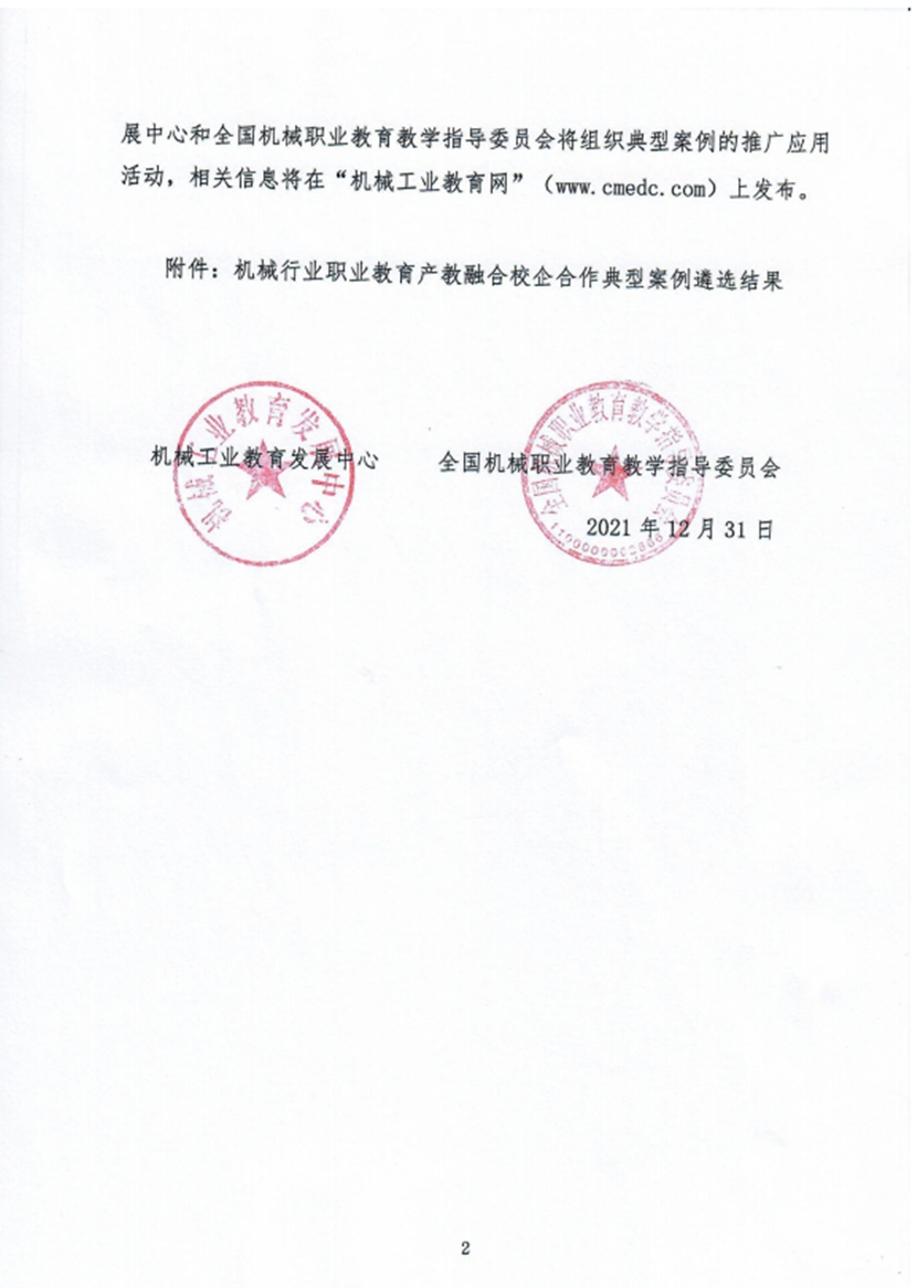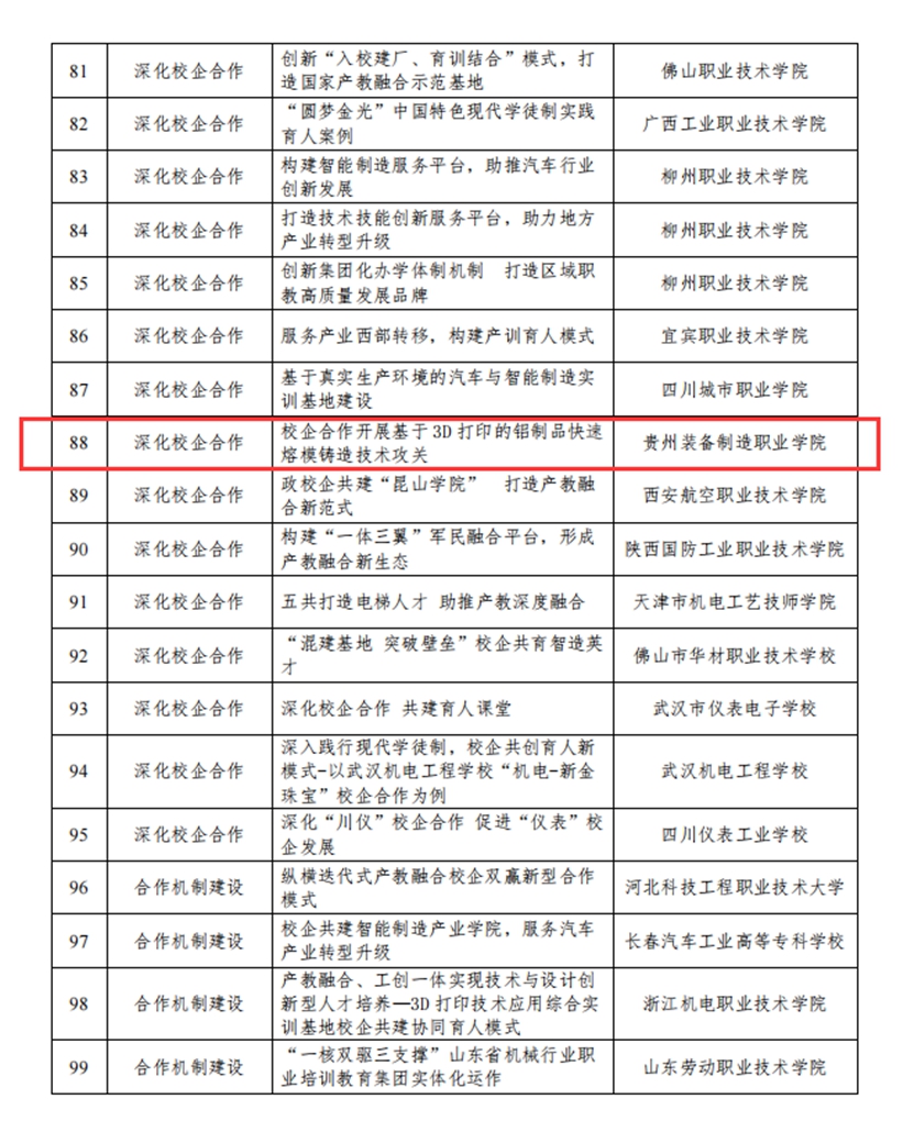 beat365官网参加机械工业教育发展中心和全国机械职业教育教学指导委员会组织的职业教育产教融合校企合作典型案例申报,经材料审查和专家评审,共有115项案例入围机械行业职业教育产教融合校企合作典型案例,其中,beat365官网申报的案例《校企合作开展基于3D打印的铝制品快速熔模铸造技术攻关》获优秀案例。