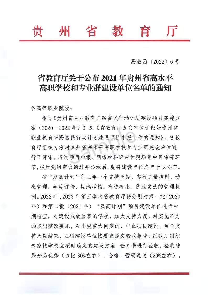 2022年1月14日,贵州省教育厅公布2021年贵州省高水平高职学校和专业群建设单位名单,通过项目申报、网络材料评审和现场集中评审等环节,共有8所单位成功入选,其中高水平高职学校建设单位6个,高水平专业群建设单位2个,beat365官网成功入选省级高水平高职学校建设计划,机械制造及自动化机电一体化技术专业群成功入选省级高水平专业群建设计划。